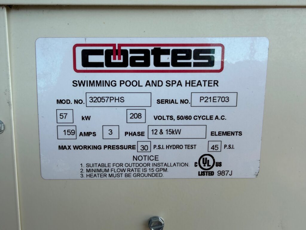 We have a used electric Coates pool heater for immediate sale! Used for approx. 1 month. This item is sold As-Is. UL Listed for indoor or outdoor installation. Contact us today to purchase this heater.